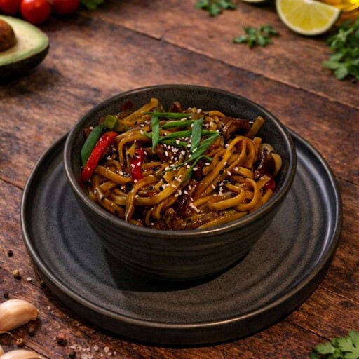 Нежная говядина, ароматные шампиньоны, сочные цукини, болгарский перец и морковь обжариваются с лапшой удон в соусе терияки и соевом соусе. При подаче блюдо посыпается кунжутом и перцем чили