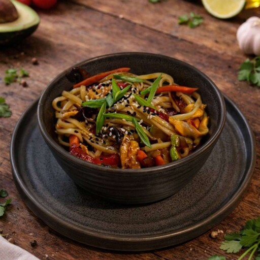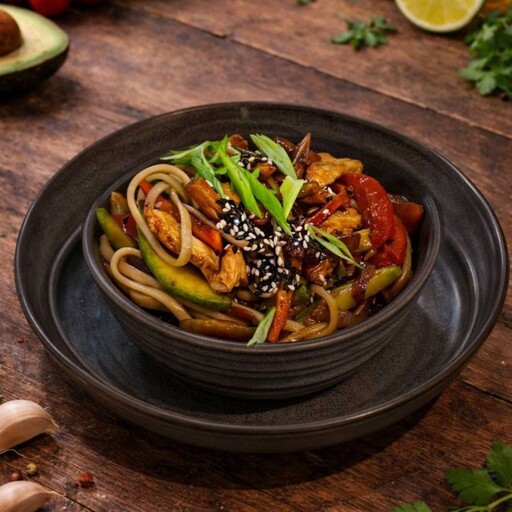 Нежная курица, ароматные шампиньоны, сочный болгарский перец, цукини, морковь и лук в сочетании с лапшой удон под соусом терияки и соевым соусом. При подаче блюдо посыпается кунжутом